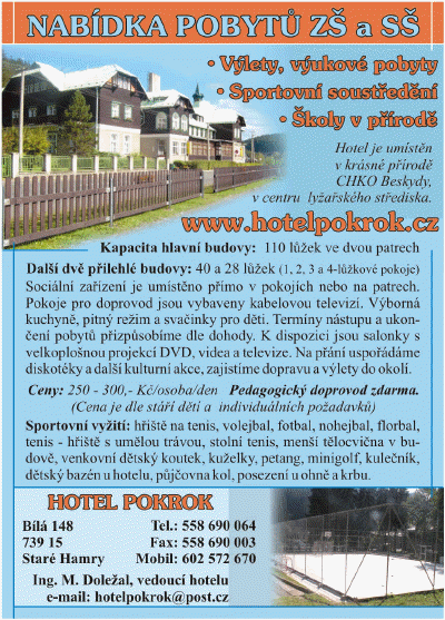 Základní ] O úroveň výš ] Autopal ] Třemešek ] Běla ] Beskyd ] Bezruč ] Bílá ] Bobrovník ] Bohema ] Bohemaland ] Branná ] Brian ] Bučina ] Camping Rožnov ] Centroprojekt ] Čekyně ] Červenohorské sedlo ] Čubernice ] Domeček Kouty ] Dominika ] Dlouhé stráně ] Dům sv. Josefa ] Eden ] Energetik ] Hotel Červenohorské sedlo ] Hradec  nad Moravicí ] Charbulák ] Chiranka ] Javor ] Jelenovska ] Karlštejn ] Ovčárna ] Pod Smrkem ] Pohoda ] [ Pokrok ] Praha ] Proletář ] chata Kamzík ] Kamzík ] Kaťuša ] Kopánky ] Krupá ] Kyčera ] Liga 100 ] Liščí mlýn ] Maják ] Malenovice ] Masarykova ] Miloňov ] Mír ] Mnichov ] Morava ] Moravice ] Na Skalkách ] Nikola ] Oaza ] Pepova bouda ] Pohoda (2) ] Prometheus ] Račí údolí ] Ramzovské sedlo ] Ramzová ] Rališka ] Rejvíz ] Restaurace ] Retaso ] RK Losinka ] Ropička ] RS SKM UP ] Ranč u zvonu ] Skalíkova louka ] Slatina ] SVČ ] Svornost ] Selanka ] Seninka ] Severka ] ŠVP Bečva ] Tatra ] U Holubů ] U Orla ] U Kance ] U Kateřiny ] U Studánky ] Unigeo ] Venuše ] Vinium ] Vlčí Důl ] Všemina ] Zákopčí ]