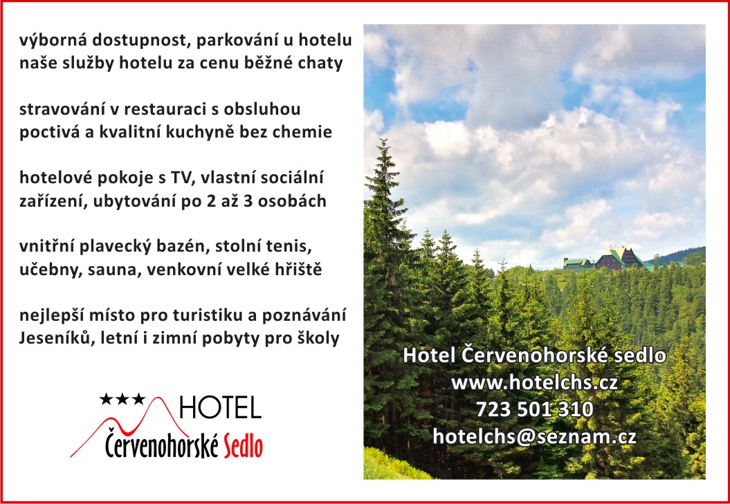 Základní ] O úroveň výš ] Autopal ] Třemešek ] Běla ] Beskyd ] Bezruč ] Bílá ] Bobrovník ] Bohema ] Bohemaland ] Branná ] Brian ] Bučina ] Camping Rožnov ] Centroprojekt ] Čekyně ] Červenohorské sedlo ] Čubernice ] Domeček Kouty ] Dominika ] Dlouhé stráně ] Dům sv. Josefa ] Eden ] Energetik ] [ Hotel Červenohorské sedlo ] Hradec  nad Moravicí ] Charbulák ] Chiranka ] Javor ] Jelenovska ] Karlštejn ] Ovčárna ] Pod Smrkem ] Pohoda ] Pokrok ] Praha ] Proletář ] chata Kamzík ] Kamzík ] Kaťuša ] Kopánky ] Krupá ] Kyčera ] Liga 100 ] Liščí mlýn ] Maják ] Malenovice ] Masarykova ] Miloňov ] Mír ] Mnichov ] Morava ] Moravice ] Na Skalkách ] Nikola ] Oaza ] Pepova bouda ] Pohoda (2) ] Prometheus ] Račí údolí ] Ramzovské sedlo ] Ramzová ] Rališka ] Rejvíz ] Restaurace ] Retaso ] RK Losinka ] Ropička ] RS SKM UP ] Ranč u zvonu ] Skalíkova louka ] Slatina ] SVČ ] Svornost ] Selanka ] Seninka ] Severka ] ŠVP Bečva ] Tatra ] U Holubů ] U Orla ] U Kance ] U Kateřiny ] U Studánky ] Unigeo ] Venuše ] Vinium ] Vlčí Důl ] Všemina ] Zákopčí ]