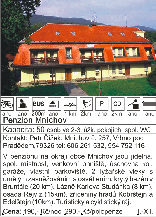 Základní ] O úroveň výš ] Autopal ] Třemešek ] Běla ] Beskyd ] Bezruč ] Bílá ] Bobrovník ] Bohema ] Bohemaland ] Branná ] Brian ] Bučina ] Camping Rožnov ] Centroprojekt ] Čekyně ] Červenohorské sedlo ] Čubernice ] Domeček Kouty ] Dominika ] Dlouhé stráně ] Dům sv. Josefa ] Eden ] Energetik ] Hotel Červenohorské sedlo ] Hradec  nad Moravicí ] Charbulák ] Chiranka ] Javor ] Jelenovska ] Karlštejn ] Ovčárna ] Pod Smrkem ] Pohoda ] Pokrok ] Praha ] Proletář ] chata Kamzík ] Kamzík ] Kaťuša ] Kopánky ] Krupá ] Kyčera ] Liga 100 ] Liščí mlýn ] Maják ] Malenovice ] Masarykova ] Miloňov ] Mír ] [ Mnichov ] Morava ] Moravice ] Na Skalkách ] Nikola ] Oaza ] Pepova bouda ] Pohoda (2) ] Prometheus ] Račí údolí ] Ramzovské sedlo ] Ramzová ] Rališka ] Rejvíz ] Restaurace ] Retaso ] RK Losinka ] Ropička ] RS SKM UP ] Ranč u zvonu ] Skalíkova louka ] Slatina ] SVČ ] Svornost ] Selanka ] Seninka ] Severka ] ŠVP Bečva ] Tatra ] U Holubů ] U Orla ] U Kance ] U Kateřiny ] U Studánky ] Unigeo ] Venuše ] Vinium ] Vlčí Důl ] Všemina ] Zákopčí ]